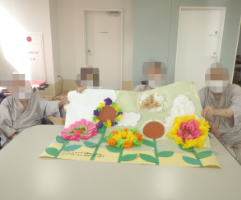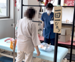 認知症ケアチームと連携し、せん妄に対する評価を実施しており、看護師とともに認知症やせん妄の患者さんに対しての転倒・転落についての検討や日中の過ごしかたなど患者さんのライフスタイルに合わせて、1日の生活に対してアプローチを行っています。また、月に2回レクリエーションを開催しています。病棟レクリエーションにて、認知症体操や口腔体操などを行い離床や抑制解除に働きかけ、OTレクリエーションではお正月やクリスマス、お花見などで季節を感じ、他者交流を行うことで生活リズムの獲得や認知機能・身体機能の維持向上を図っています。