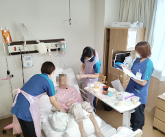 週に1回PT・OTと連携しミールラウンドを行い、食事摂取方法、姿勢、食事内容などを観察し、より安全に美味しく、また適切な食事がとれるよう検討していきます。