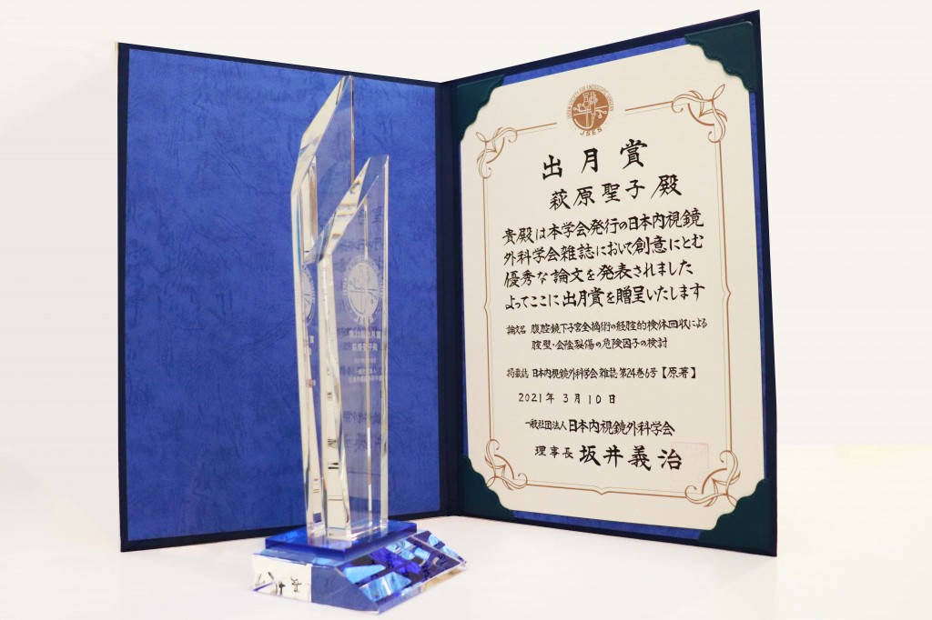 「出月賞」は日本における内視鏡下手術の発展に貢献した医療人に授与されるもので、『日本内視鏡外科学会雑誌』に掲載された投稿論文のなかから最優秀論文が選考され、授与される賞です。