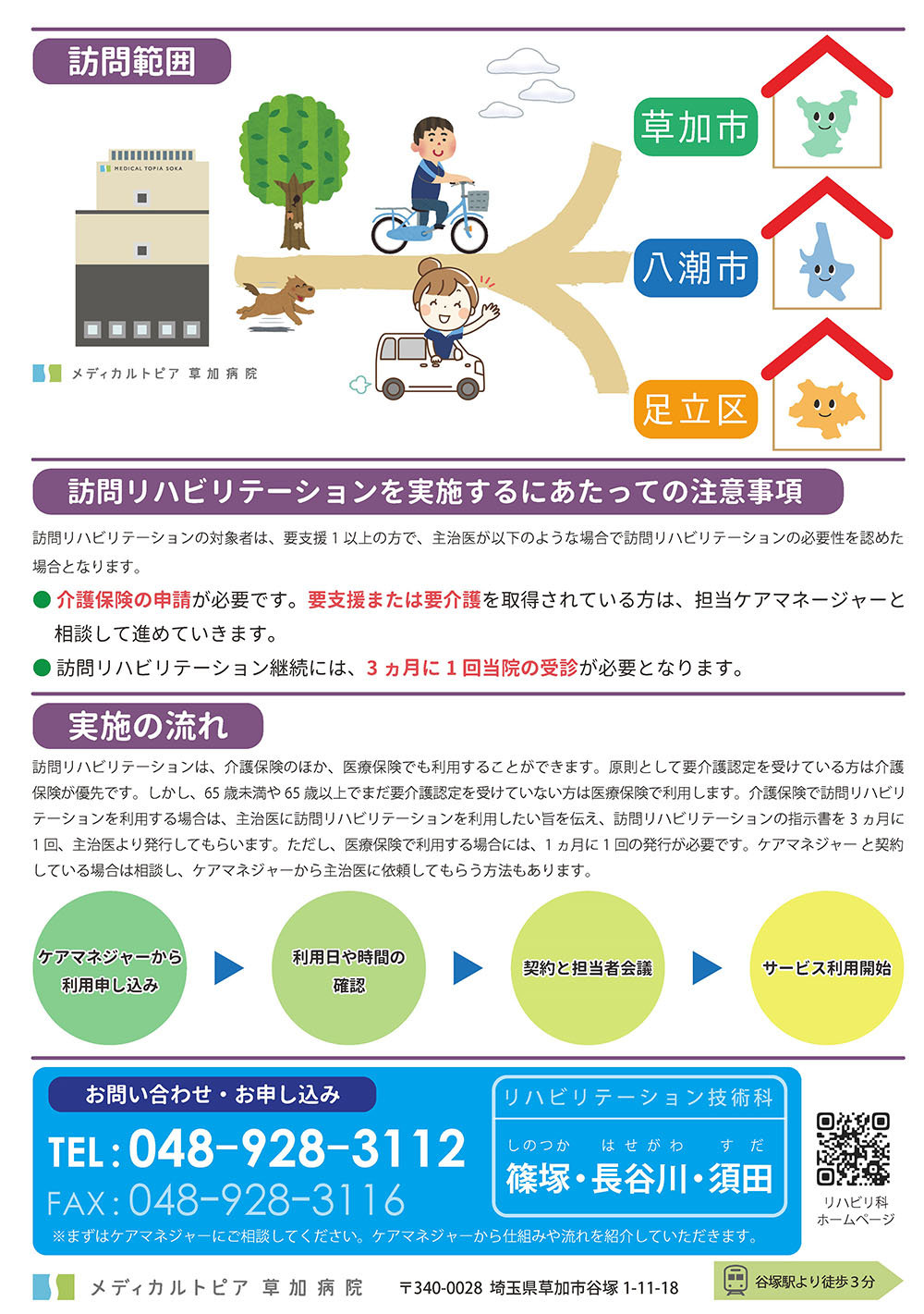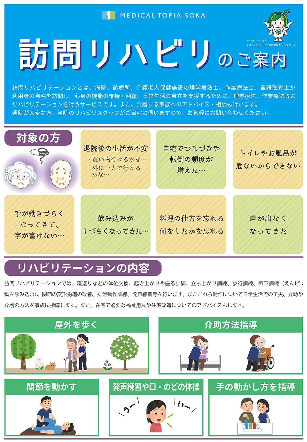 当院リハビリテ ーション技術科より利用者のご自宅を訪問し、日常生活の回復をお手伝い致します。通院が大変な方や退院後の生活に不安を感じている方、ぜひ当院までご相談くださいませ。
