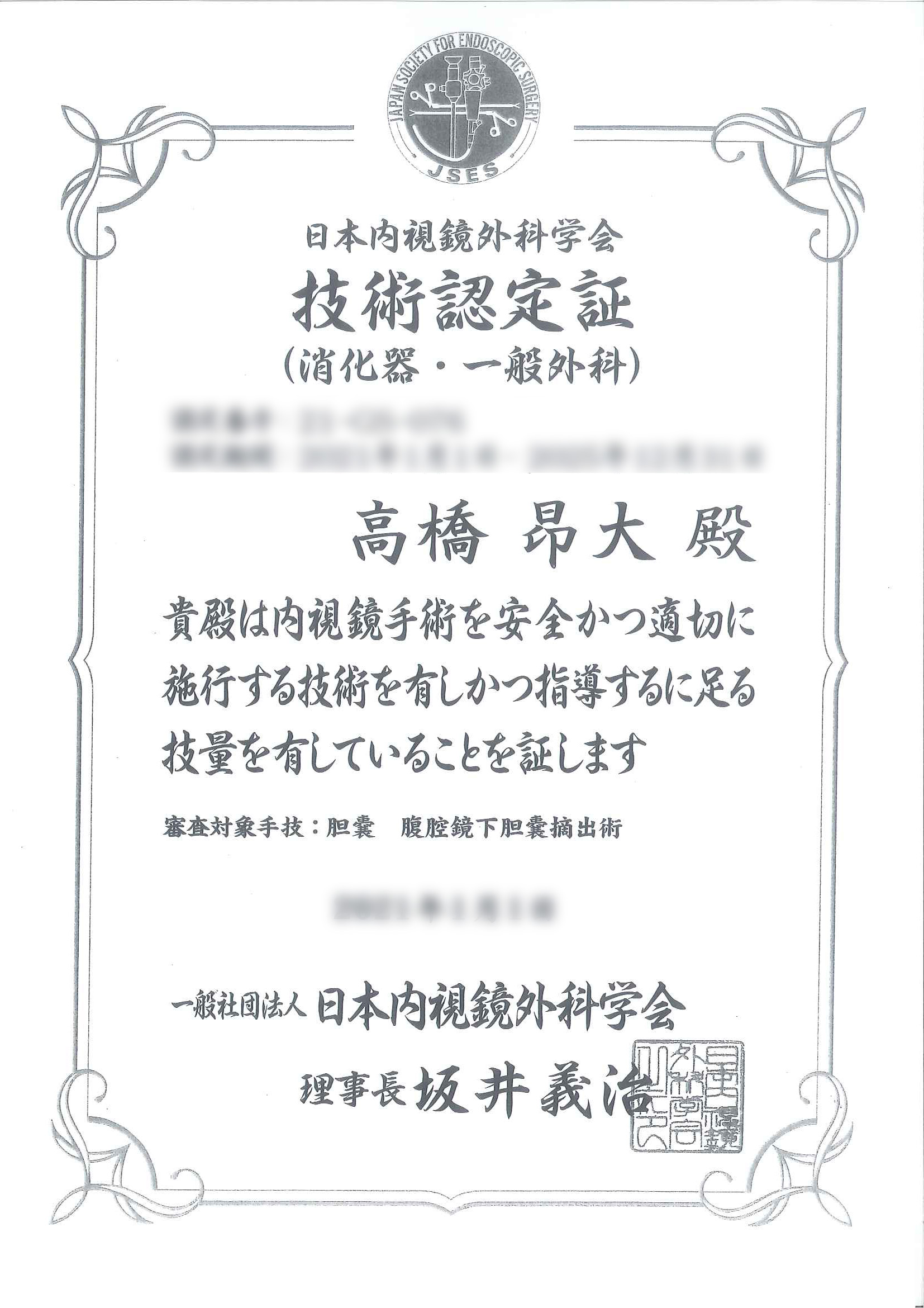 当院外科の高橋昂大医師が狭き門を通り抜け、日本内視鏡外科学会技術認定証(消化器・一般外科)を取得しました!これで当院の外科チーム全員が技術認定医となります!!