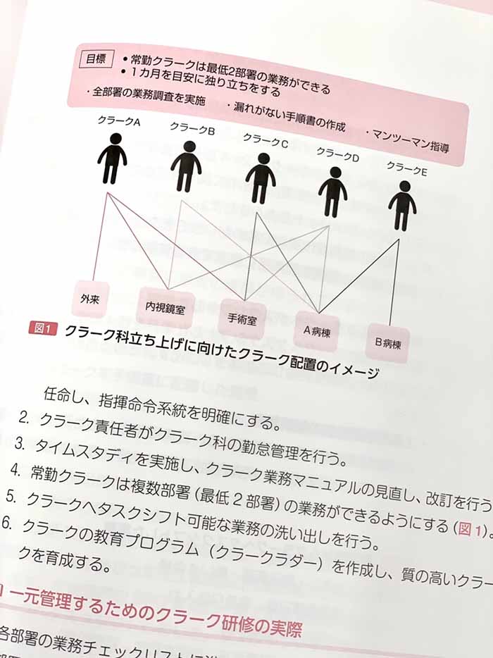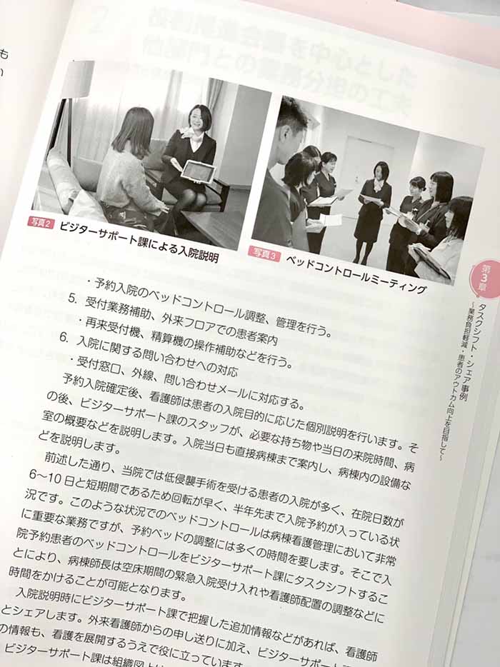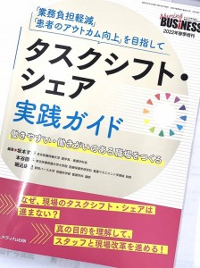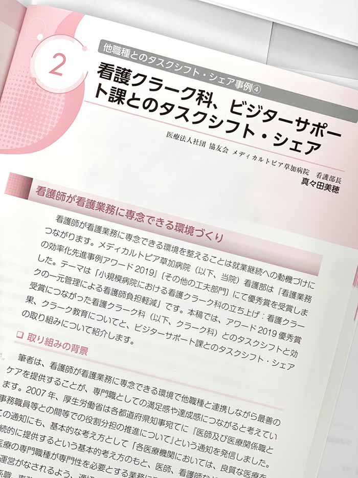 MCメディカ出版社発行の「タスクシフト・シェア実践ガイド」に当院真々田看護部長が執筆した内容が掲載されました。 執筆テーマは「看護クラーク科、ビジターサポート科とのタスクシフトシェア」です。看護師の負担を軽減し、本来の業務に専念できるような環境づくりに工夫した取り組みの背景や成果、他職種とタスクシフト・シェアによる相乗効果の内容になります。
