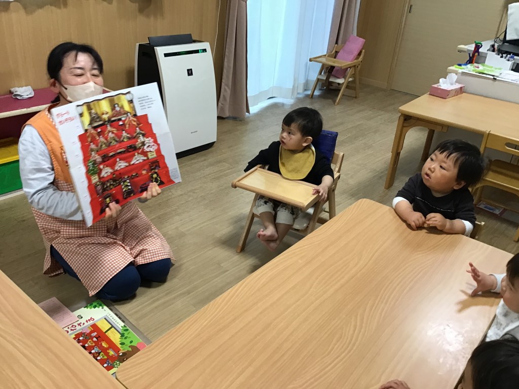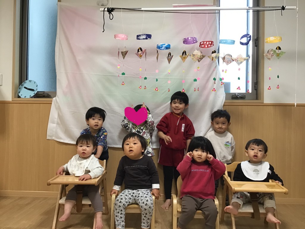 絵本でおひなさまのお話を聞いたり、ひなあられを味わったり、季節の行事を全身で楽しむ姿がとても愛らしかったです。最後は、子どもたちは手作りの飾りの前でにっこり集合写真を????